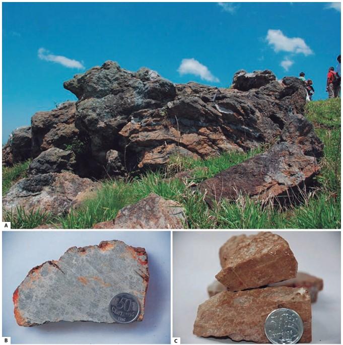 | Este geossítio está localizado no morro do Pico Pelado, constituindo, também, um mirante natural. Afloram duas lentes de marunditos e topazitos, possuindo a maior delas uma espessura de aproximadamente 60 m. Afloramentos in situ, de alguns metros de comprimento, estão associados a matacões e blocos dispersos. Os marunditos possuem cor azul escura, granulação variando de fina a grossa, possuindo alguns exemplares minerais de coríndon de aproximadamente 1 cm de diâmetro. Os topazitos apresentam granulação muito fina e cores variando entre marrom (quando muito ricos em rutilo) e branca. Há abundância de veios tardios compostos essencialmente por coríndon ± rutilo ou por muscovita ± margarita. A sua importância didática reside em representarem o produto metamórfico de rochas afetadas por processos hidrotermais-metassomáticos que mudaram a composição original de protolitos ígneos e vulcanoclásticos e geraram zonas de alteração argílica e argílica avançada, pré-eventos metamórficos associados a processos mineralizantes em ouro. Estas lentes estão associadas a pequenos corpos de sericita-xistos e sericita-quartzo xistos que apresentam dobras fechadas D2 associadas à geração de uma foliação de crenulação S2 que exemplificam processos metamórficos causados por processos de compressão crustal. Estão encaixadas em um pacote composto predominantemente por metatufos. Devido à proximidade da zona de cisalhamento do Rio Jaguari muitas destas rochas apresentam uma foliação milonítica Sm, muito didática para explicar processos de moagem e recristalização provocados por grandes sistemas de falhas presentes em cinturões metamórficos. Pela sua mineralogia exótica representam rochas-guias para a exploração de ouro em sequências metavulcanossedimentares metamorfisadas em grau médio (Pérez-Aguilar et al., 2011). |