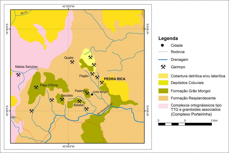 No Brasil, os diamantes foram descobertos na Serra do Espinhaço, nos arredores do então Arraial do Tejuco (atual Diamantina), por volta de 1710. Esses diamantes eram recuperados de depósitos aluvionares, à semelhança dos provenientes da Índia e Bornéo os outros dois locais onde eram explorados no mundo. A expansão da mineração de diamantes ao longo da Serra do Espinhaço no rumo norte, fez com que diversos novos sítios fossem progressivamente descobertos. Na região do Espinhaço onde se localiza Grão Mogol, as primeiras publicações sobre tais achados são devidas ao mineralogista José Bonifácio de Andrada e Silva, ao informar sobre a lavra de diamantes ao longo do Rio Itacambiruçu (Silva, 1792). Os naturalistas Spix & Martius (1828), visitaram a região no início do século XIX e relataram que tais descobertas se deram por volta de 1781, na serra de Santo Antônio (ou do Grão-Mogol), a partir das quais permitiram o surgimento do povoado de Grão Mogol. No início do século XIX, começaram a circular os rumores na região diamantífera da Serra do Espinhaço de que nos arredores de Grão Mogol diamantes estavam sendo recuperados a partir de sua própria “rocha matriz” (Moraes, 1934). Como em Diamantina os conglomerados do “tipo-Sopa” só foram reconhecidos como portadores de diamantes na década de 1850, tais achados são anteriores. As informações científicas consideradas pioneiras foram devidas ao dinamarquês Claussen (1841a; b), embora posteriormente tenham surgido sérias dúvidas sobre se tal autor de fato esteve na região enfocada. Da maior importância para o entendimento da questão é a obra de Helmreichen (1846), que descreveu os diamantes com suas respectivas localizações e processos de mineração utilizados, além dos modos de ocorrência do mineral naquela localidade. Nesse estudo, foram detalhados os depósitos do Córrego dos Bois (além de outros), bem como o conglomerado adjacente a este córrego, conhecido como “Pedra Rica” (Fig.3) e descrito como um “itacolomito de aspecto conglomerático”. Sem dúvidas, esse achado representou o primeiro a nível mundial de diamantes hospedados em rocha. Outras referências históricas referentes à Pedra Rica foram Heusser & Claraz (1859), Derby (1879; 1882) e Gorceix (1884a; b). Entretanto, os mais importantes estudos de detalhe foram efetuados na década de 1930, cujos resultados encontram-se na obra de Moraes (1934). Esse autor levantou os principais depósitos diamantíferos da região de Grão Mogol, trazendo novas informações sobre a geologia da área e da relação desta com a Pedra Rica (Fig.4). Seus relatos históricos também são dignos de nota: “Data de 1827 a mineração do diamante (na rocha) em Grão Mogol. Em 1839, Pedro Claussen visitou a localidade e em 1841 publicou um trabalho na Revista da Academia Real de Bruxellas, em que alludia á ocorrência de diamante na rocha actualmente classificada como conglomerato. Em 1841, Virgil von Helmreichen realizou uma viagem a Grão Mogol, devido á informação de lá ser commum o encontro do diamante encravado na rocha... elle enviou do Rio de Janeiro á Academia de Sciencias de Vienna, uma memória sobre o assumpto de sua viagem, que veio a lume em 1846”. No entanto em relato, pouco conhecido de Helmreichen (1847), questiona-se a autoria do descobrimento de P. Claussen: “Espero que meu trabalho sobre a ocorrência dos diamantes na Serra do Grão-Mogol, que enviei a Viena há algum tempo, já tenha ido para o prelo. Tenho de confessar: muitas vezes fiquei aborrecido porque esse trabalho ficou tanto tempo sem ser publicado, não porque tenha a presunção de que seja muito bom, pois acredito que apresenta muitos erros que me escaparam. Entretanto, fui pelo menos o primeiro – e até agora o único – homem do ramo a estudar a ocorrência dos diamantes em sua matriz no próprio local, e a publicação desse trabalho pelo menos vai poder corrigir as inverdades que o dinamarquês Peter Klausen teve a ousadia de relatar ao mundo com uma autoridade indevida para alguém que nunca pisou nesse local em toda a sua vida. Apesar disso, sua dissertação parece ter tido uma boa aceitação, visto que até Humboldt se baseia nisso na página 278 do seu Kosmos”. Essas informações, se verdadeiras, confirmam a primeira descrição científica da Pedra Rica como a de Virgil von Helmreichen. A Serra do Espinhaço apresenta formas de relevo características e similares, destacando-se certas feições principais moldadas segundo o tipo ou associação de rochas presentes. Ao oeste da serra, as depressões pediplanas caracterizam o domínio das rochas do Embasamento Cristalino. Na zona serrana, os quartzitos, principalmente quando se apresentam com grão fino e alto grau de maturidade (características que são predominantes na área), mostram escarpas com ângulos elevados ou mesmo subverticiais que acompanham uma direção geral norte-sul, concordante com a estruturação regional dos dobramentos e do plano da foliação principal. Elevações abruptas como morros testemunhos em superfícies de aplainamento, resultado da erosão diferencial, são típicas deste setor serrano. King (1956) reconheceu superfícies de aplainamento cíclicas, das quais, na região do Espinhaço, aparecem as superfícies “Pós-Gondwana” e “Sul-Americana”, respectivamente, no Cretáceo Superior e Terciário Médio-Superior (Fig.4c). Nas proximidades de Grão Mogol, a serra apresenta certas peculiaridades decorrentes do seu afinamento por cerca de 3-7 km, em contraste com as larguras de 60-80 km verificadas na região de Diamantina. As partes aplainadas mais altas (1.200-1.300 m) formaram-se em consequência do Ciclo Pós-Gondwana. A superfície em torno de 1.000 m (Sul-Americana) aparece amplamente desenvolvida a leste da serra, sobre rochas do Grupo Macaúbas, mas ocorre também em áreas restritas no Supergrupo Espinhaço, onde chega a formar delgada