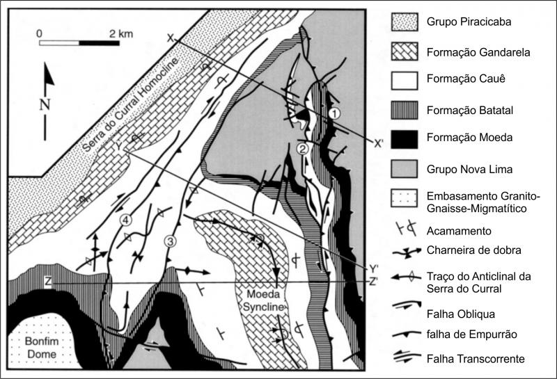 A Serra do Rola Moça está situada na área em que ocorre a junção do Sinclinal Moeda com o Homoclinal da Serra do Curral, onde afloram, principalmente, as rochas do Supergrupo Minas (Fig. 7 e Fig. 8). Essas duas estruturas estão envolvidas pelas rochas do Grupo Nova Lima (greenstone belt Rio das Velhas) e do embasamento cristalino (Complexo Belo Horizonte e Gnaisses Souza Noschese). As rochas do Supergrupo Minas foram interpretadas como uma sequência metassedimentar de uma bacia do tipo rifte, que posteriormente evoluiu para uma bacia de margem passiva (Dopico et al. 2017). Seus litotipos englobam espessas camadas de quartzitos, xistos, filitos, dolomitos, formações ferríferas, grauvacas e de rochas metavulcânicas. Na base desta sucessão está o Grupo Caraça, que é composto por metaconglomerados e metarenitos aluviais e metapelitos marinhos, que estão agrupados nas formações Moeda e Batatal, respectivamente. Estudos isotópicos nos metaconglomerados e quartzitos auríferos da Formação Moeda (U-Pb em zircão e xenotima) indicaram uma idade máxima de deposição de 2,62Ga (Koglin et al. 2014). O Grupo Itabira é uma sequência sedimentar composta por formações ferríferas do tipo Lago Superior, com xistos carbonáticos, mármores ferruginosos e com raras intercalações de rochas vulcânicas intermediárias a básicas (Formação Cauê) e há também uma sequência essencialmente carbonática (Formação Gandarela) de idade 2,42Ga (Babinsky et al. 1995). O Grupo Piracicaba é composto por metaconglomerados e quartzitos ferruginosos, que gradam para metapelitos e xistos carbonosos. As idades 3353 e 2275Ma obtidas de zircões detríticos extraídos das rochas do Grupo Piracicaba indicaram padrões semelhantes dos zircões do Grupo Caraça (Machado et al. 1996). O Grupo Sabará é composto por filitos, quartzitos, metagrauvacas e rochas metavulcânicas. Essas rochas foram interpretadas como parte de uma sequência de turbiditos, tufos, rochas vulcanoclásticas, conglomerados e diamictitos sin-orogênenicos (tipo flysch), com idade máxima de sedimentação em torno de 2125 ± 4Ma (U-Pb em zircão, Machado et al. 1992). A Formação Cauê, do Grupo Itabira, é composta quase que inteiramente por uma rocha conhecida pelo nome “Itabirito”, de onde se extrai o minério de ferro do Quadrilátero Ferrífero. O itabirito é uma rocha da fácies óxido, laminada e metamorfisada, que originalmente era composta por bandas de jaspelito e cherte que foram recristalizadas, onde o elemento Fe (ferro) está presente na forma dos minerais hematita e magnetita. A magnetita também ocorre pseudomorfisada por hematita (Dorr & Barbosa, 1963). Sobre as rochas da Formação Cauê ocorre a cobertura laterítica ferruginosa conhecida pelo nome de canga. |