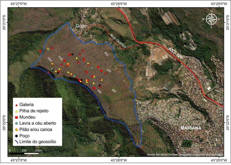 O Morro Santana de Mariana (ou Morro do Gogo) está inserido no contexto do Anticlinal de Mariana, na aba nordeste, onde também se localiza Antônio Pereira. Na zona central é onde se localiza a Mina da Passagem e no flanco sul está a Serra de Ouro Preto com diversos sítios da história da mineração, tais como, o Morro Santo Antônio de Passagem de Mariana, o Morro da Queimada, as minas da Encardideira e a Mina do Veloso. Nessas áreas o ouro foi extraído desde o século XVIII. Atualmente, o crescimento desordenado das cidades Ouro Peto e Mariana têm colocado em risco a preservação desses sítios. Em termos metalogenéticos, a mineralização de ouro ocorre principalmente na zona de contato entre o quartzito da Formação Moeda, o filito carbonáceo da Formação Batatal e os itabiritos da Formação Cauê. São veios de quartzo ricos em arsenopirita que ocorrem preferencialmente na camada de filito carbonáceo, mas que também interceptam as camadas de quartzito e de itabirito. De acordo com Heineck (1983) os corpos de minério são stratabound, compostos principalmente por quartzo-arsenopirita encaixado no contato entre o xisto e o itabirito. No inventário arqueológico realizado na área pela Prefeitura Municipal de Mariana foram identificados: pilões, sarilhos, mundéus, áreas de fundição, canais, pilhas de rejeito, brunidores, lavras a céu aberto, galerias, canoas e barragens. Além das estruturas relacionadas diretamente com a atividade mineradora, também foram identificados um conjunto de ruinas de residências, cemitério, igreja, curral, engenho, paiol, hospital e barragem. Essas estruturas foram edificadas utilizando principalmente a canga ferruginosa que é o produto do intemperismo dos itabiritos e que ocorrem recobrindo quase toda a superfície do morro (Prefeitura Municipal de Mariana, 2008). Outros aspectos interessantes do Morro Santana é que ele representa uma superfície de aplainamento coberta por canga ferruginosa e também um mirante que possibilita a vista das serras do Itacolomi e do Caraça, do Morro Santo Antônio, do centro histórico de Mariana e da antiga Mina de Maquiné. |